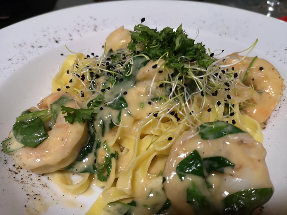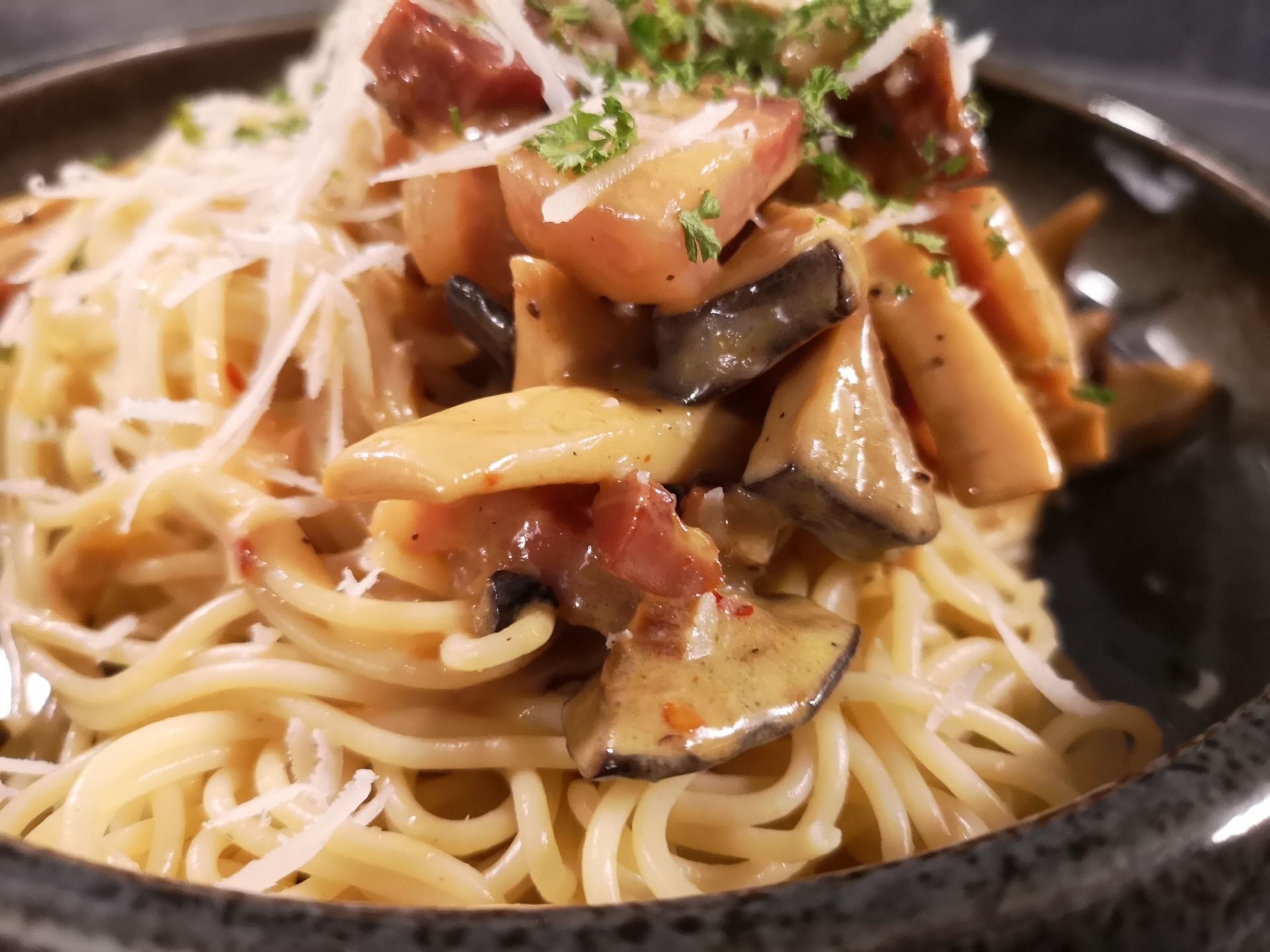 Pasta met Italiaans (pikant) spek, eryngii paddenstoelen en een roomsausje