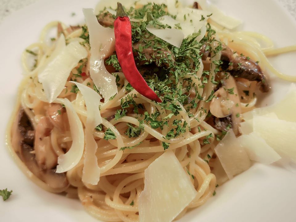 Niet veel zin om te koken dus een snelle Spaghetti all'aglio, olio e peperoncino met champignons en wat Parmigiano. Wel ****** lekker.